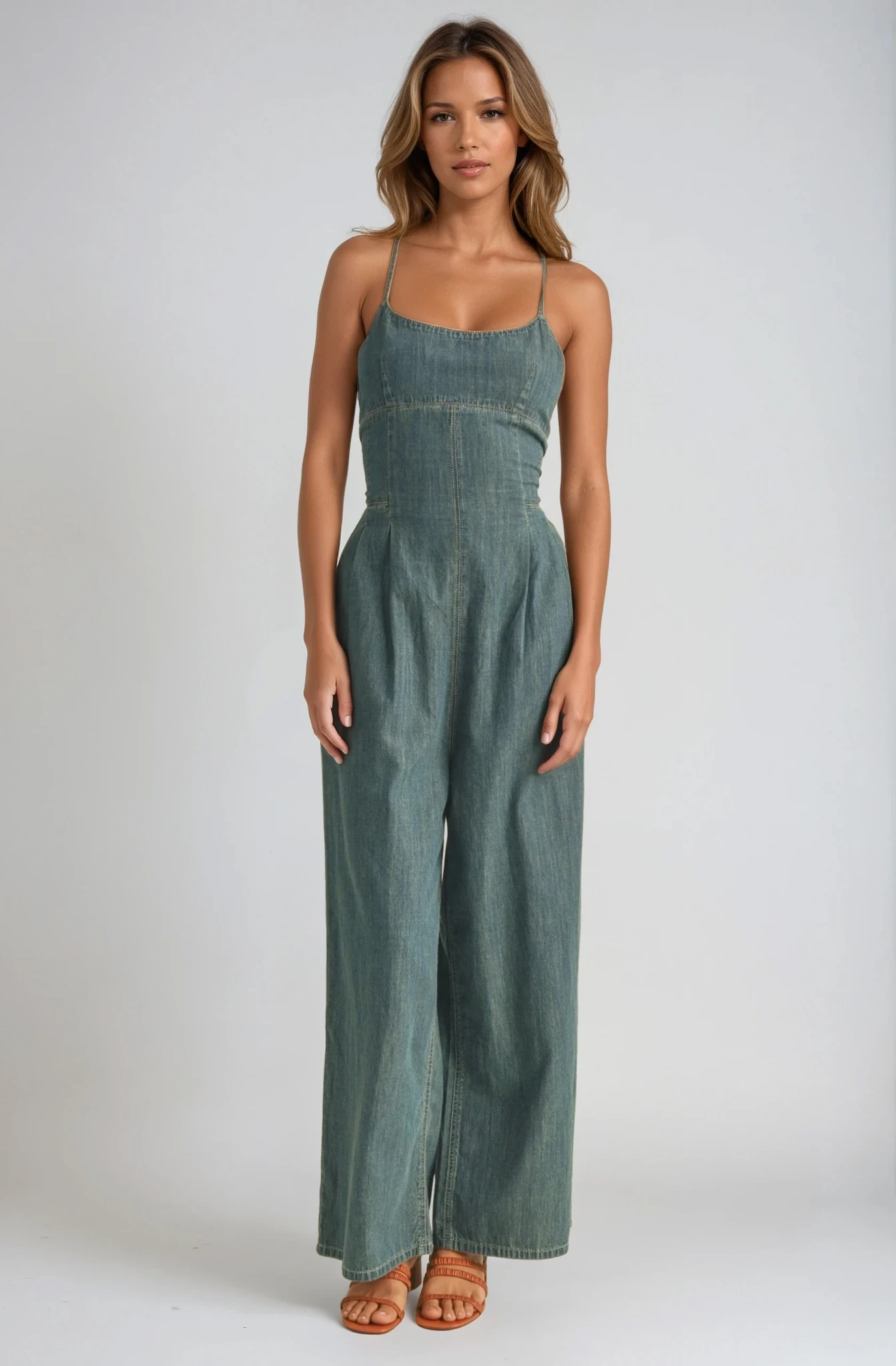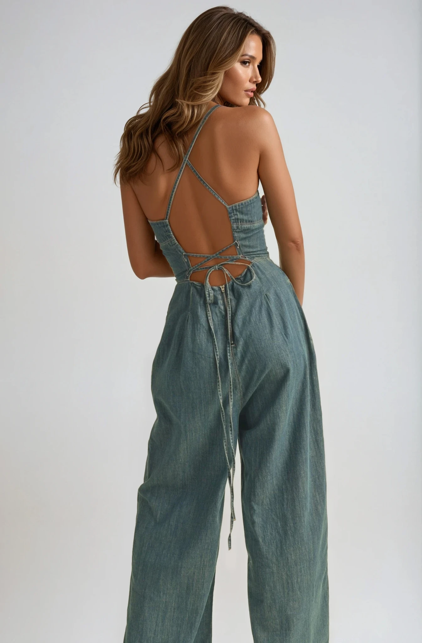 Lace-Up Washed Denim Jumpsuit