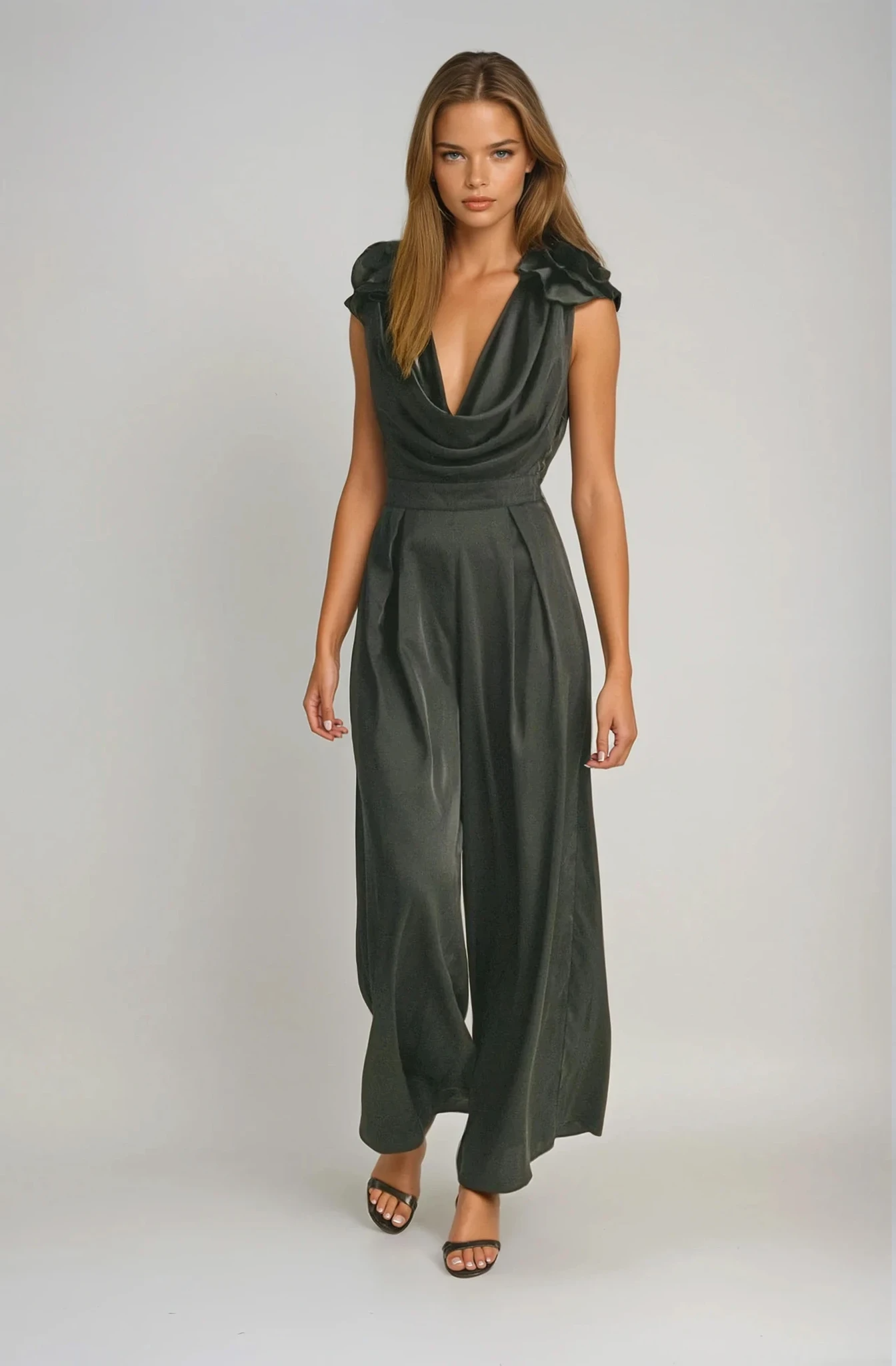 Floral Applique Deep Cowl Neck Jumpsuit in Black
