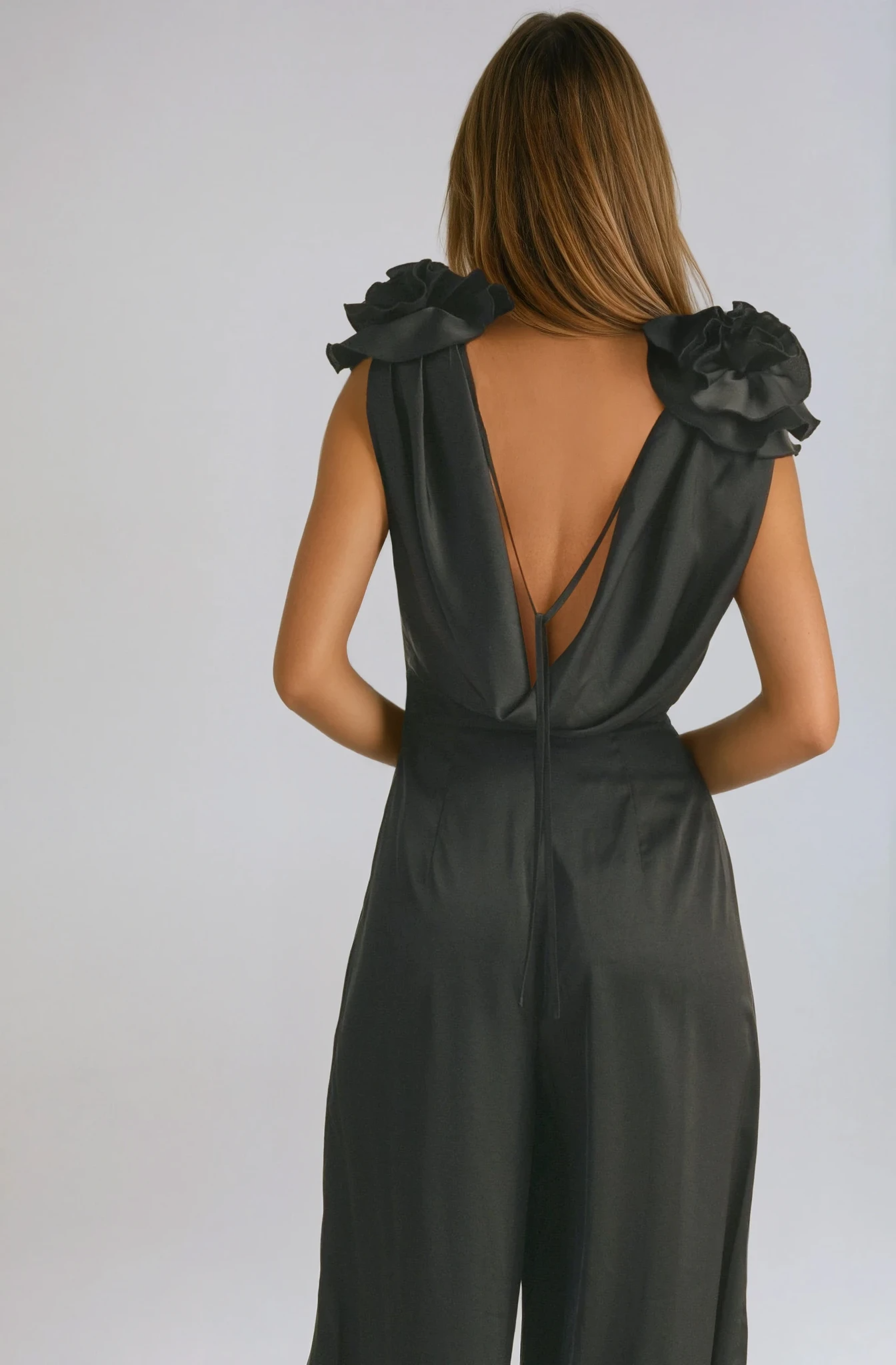 Accentuate your look with the stunning satin 3D floral applique adorning the deep cowl neck and open back of this iconic black jumpsuit. A self tie closure cinches the wide leg silhouette for a look that is sure to leave a lasting impression!