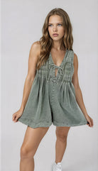 Get ready to rock this trending denim romper. With pleats galore and a front tie for added flair, this laid-back design is the ultimate must-have. Sporting a light sage denim hue, deep v-neck with a string tie and a sleeveless cut, this romper also comes with a side pocket for all your essentials.