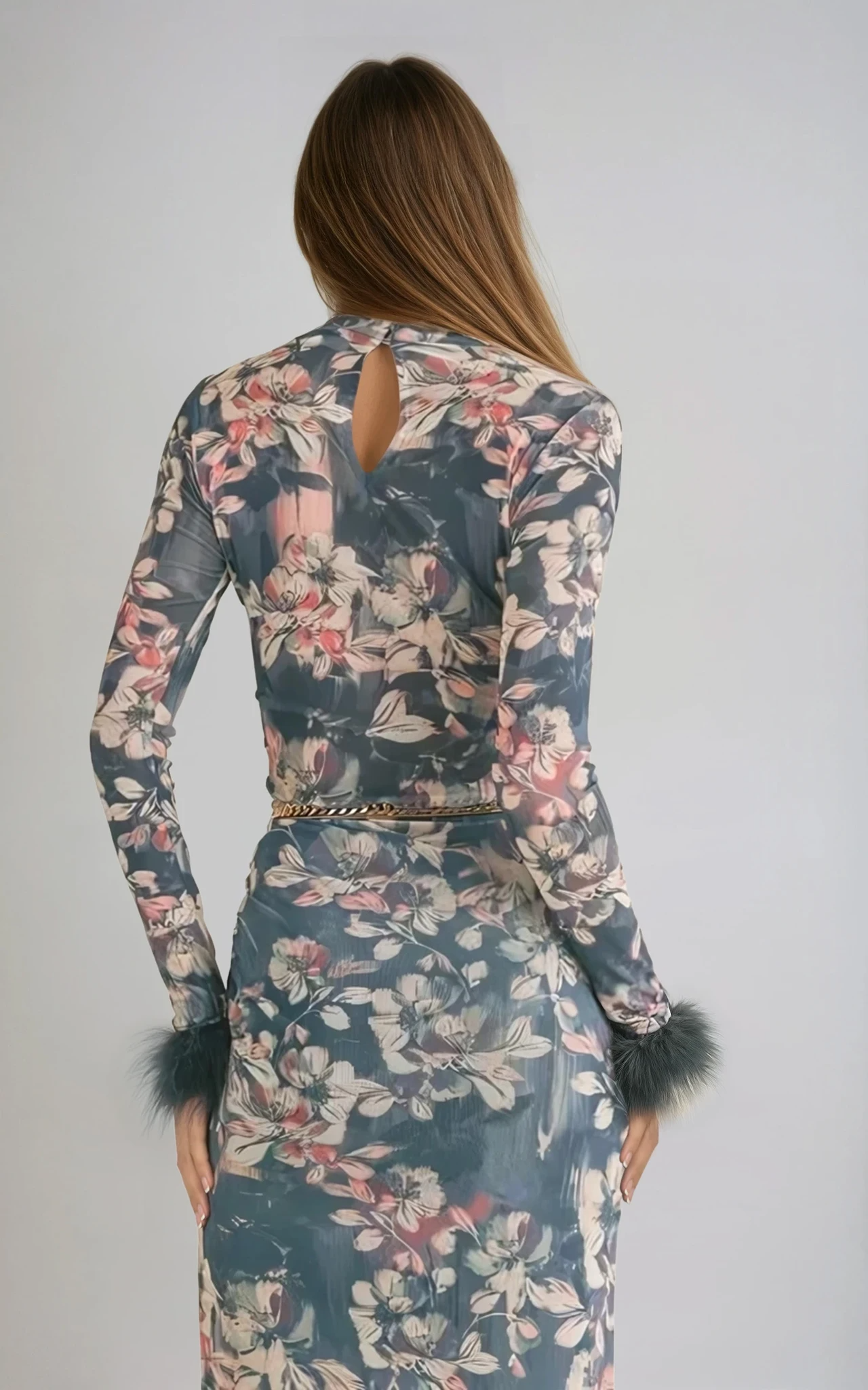 Embrace your style with this long sleeve top, featuring a midnight blue floral print and an elegant vegan feather trim. Its fitted design will ensure a flattering fit.