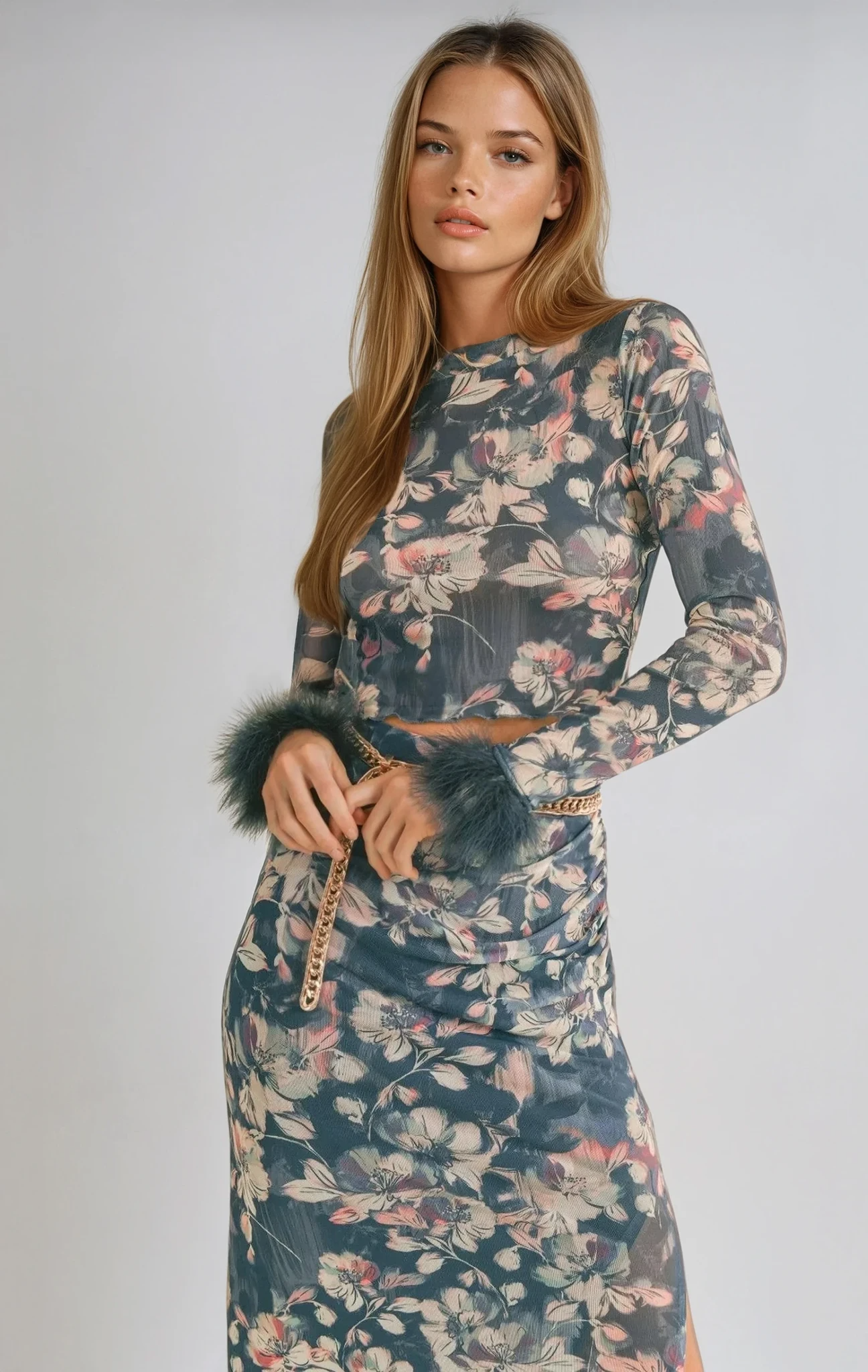 Vegan Feather Trim Floral Print Long Sleeve Top