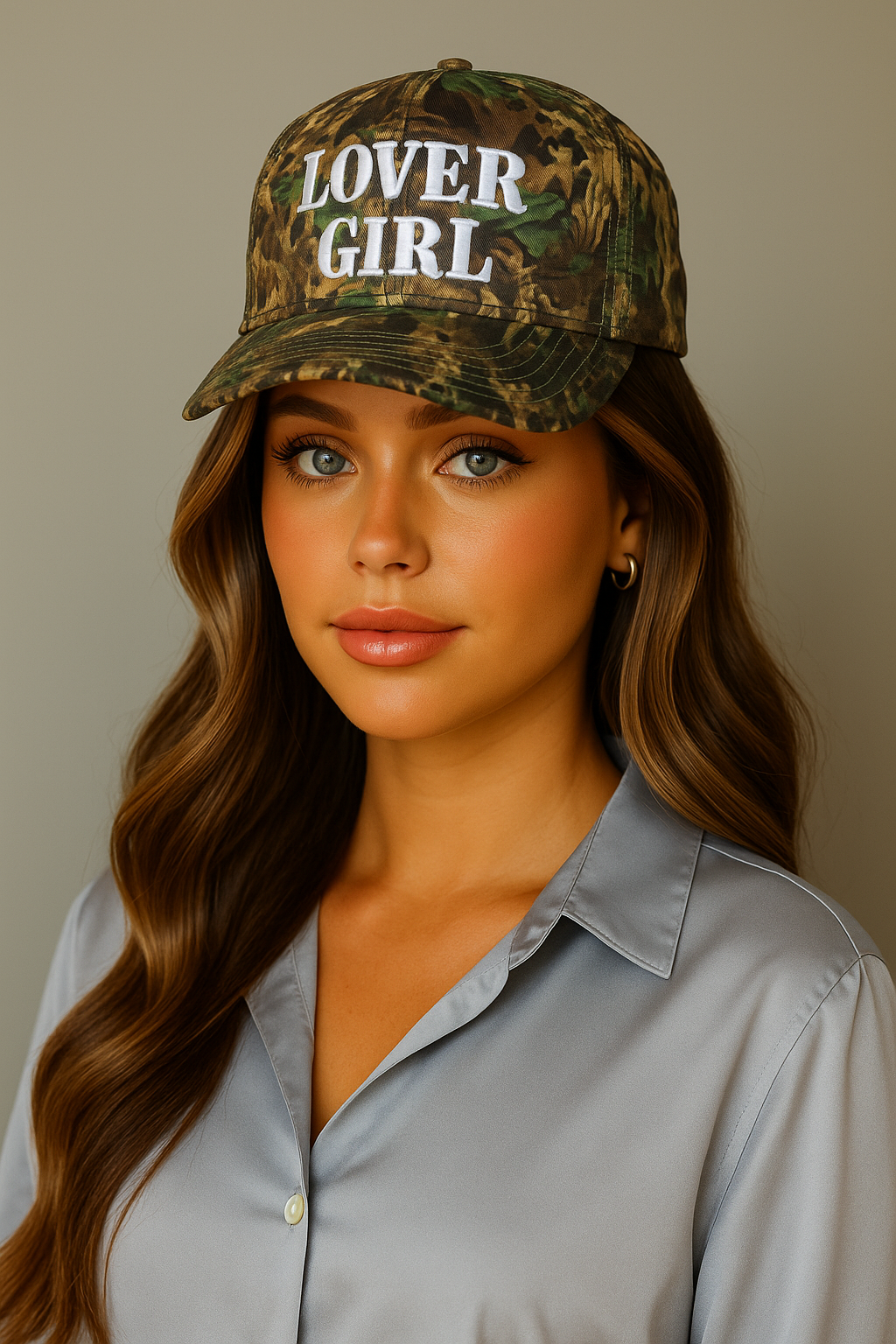 This trucker hat, inspired by Taylor, combines camo fabric with a striking white embroidered "Lover Girl" design for a stylish look.