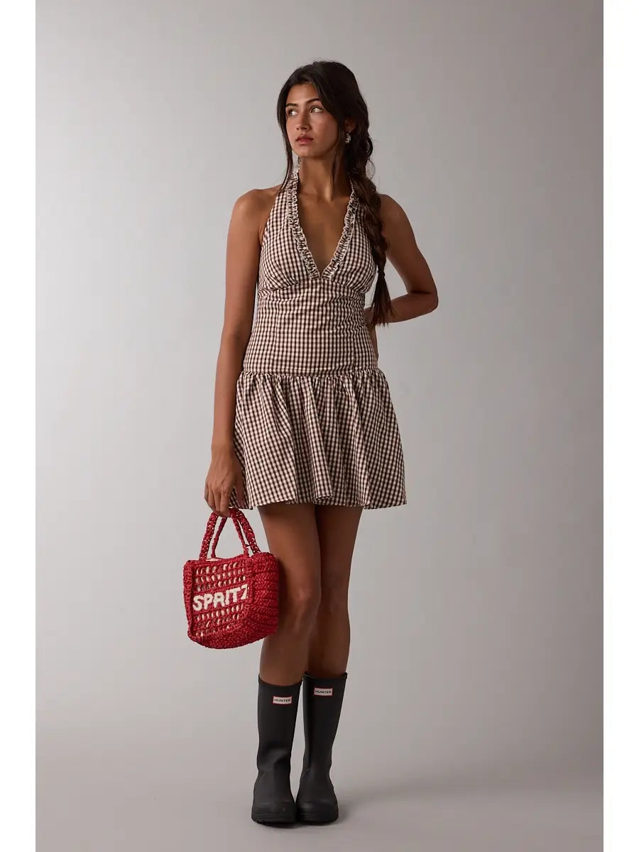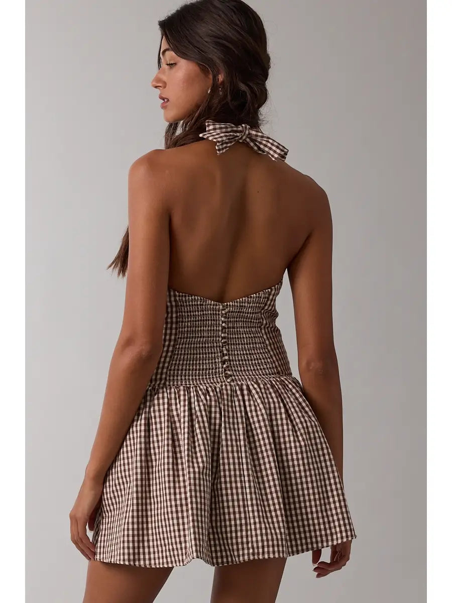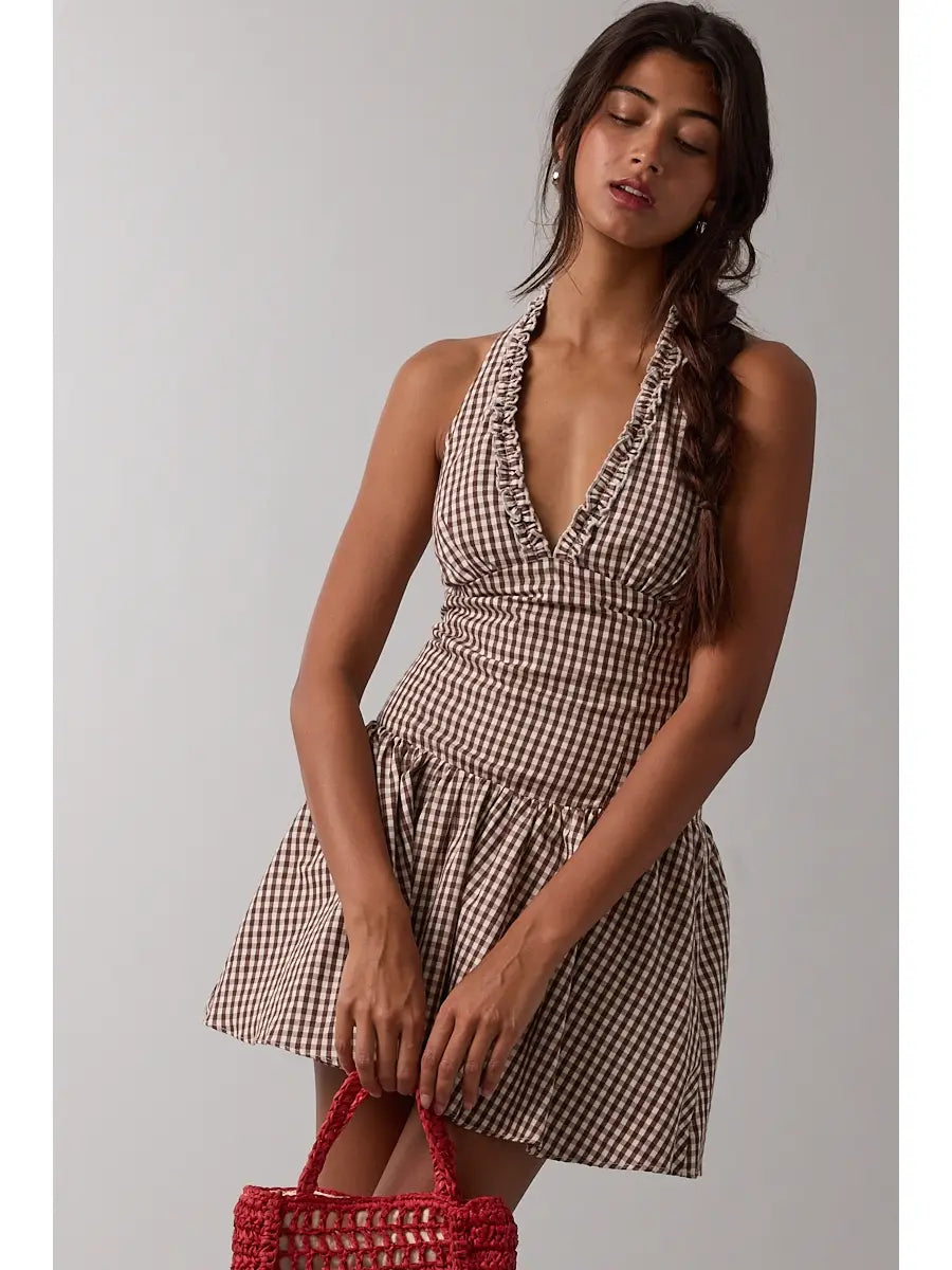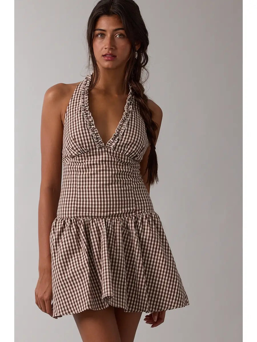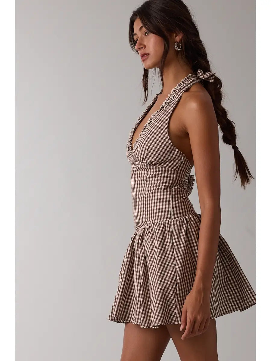 This mini dress features a halter tie neckline and a charming chocolate brown gingham pattern. It is sleeveless with a side zipper and a button closure at the back. The fit-and-flare silhouette includes a ruffle trim and built-in shorts for comfortable coverage.