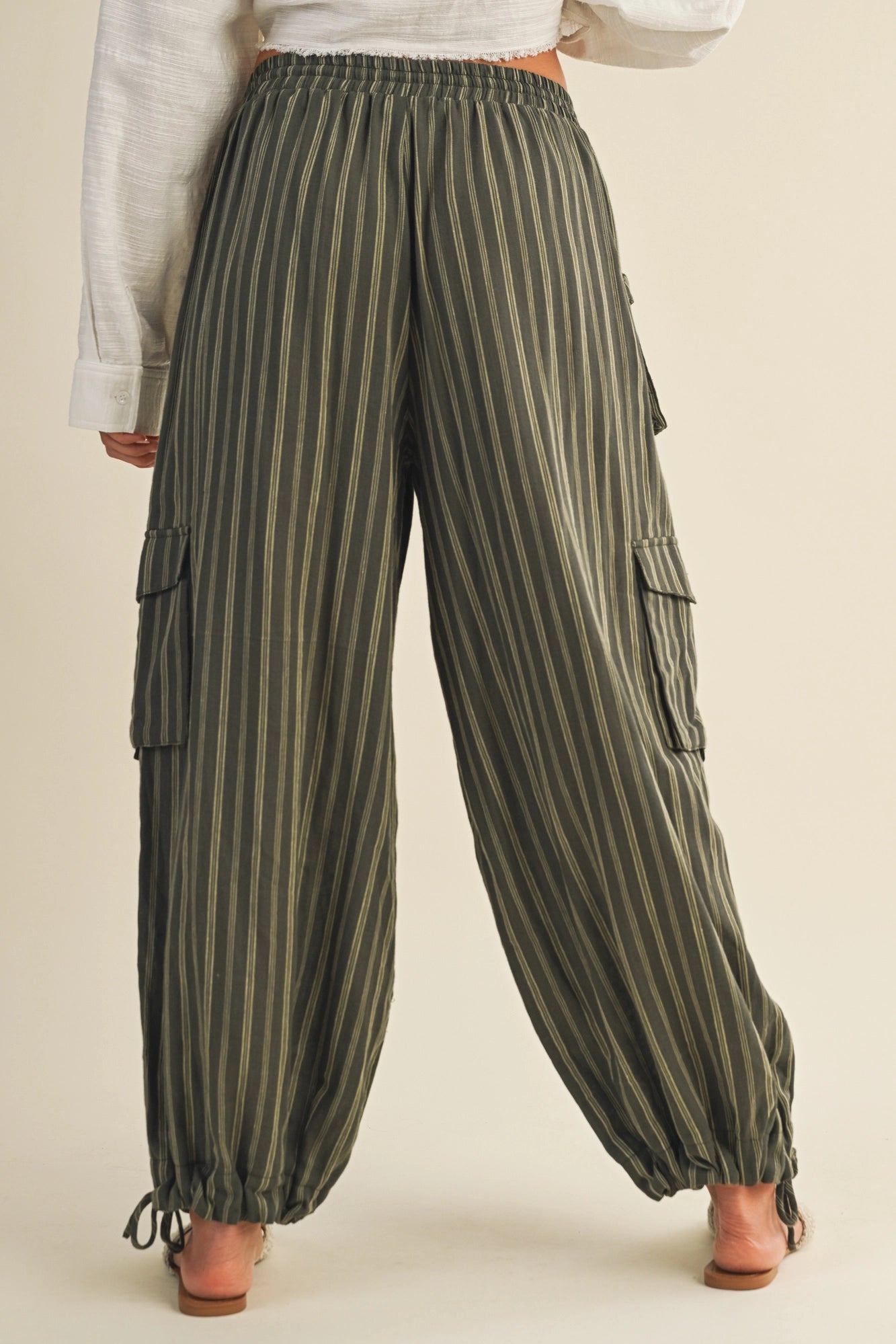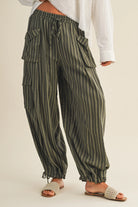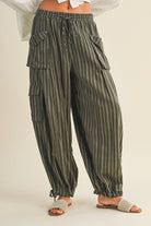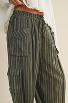 These olive green striped cargo pants feature a mid-rise fit with an adjustable drawstring waist for comfort. They offer functional pockets secured with button details, along with adjustable drawstring cuffs at the leg bottoms, allowing you to personalize your look with ease.