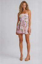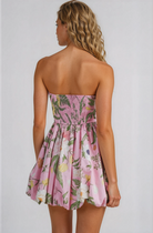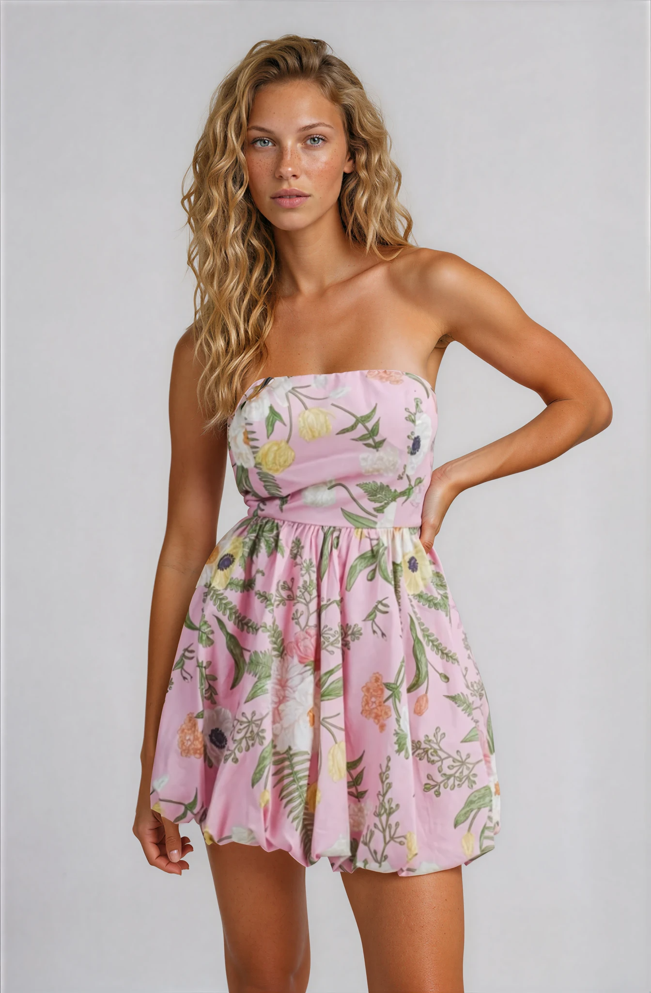 Effortlessly romantic, this strapless mini dress combines architectural design with feminine charm. The smocked back bodice and gathered waist create a flattering silhouette, while the voluminous bubble hem adds movement and playful dimension. Rendered in an allover floral print against a soft pink base, it's the perfect piece for garden parties, date nights, or any occasion calling for understated elegance. Lined for comfort and finished with a discreet side zipper for easy wear.