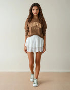 This pecan brown sweatshirt features long sleeves and a crew neckline, highlighted by a "PUMPKIN SEASON" appliqué patch. Designed with an oversized fit, it offers cozy comfort and seasonal style.