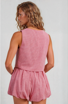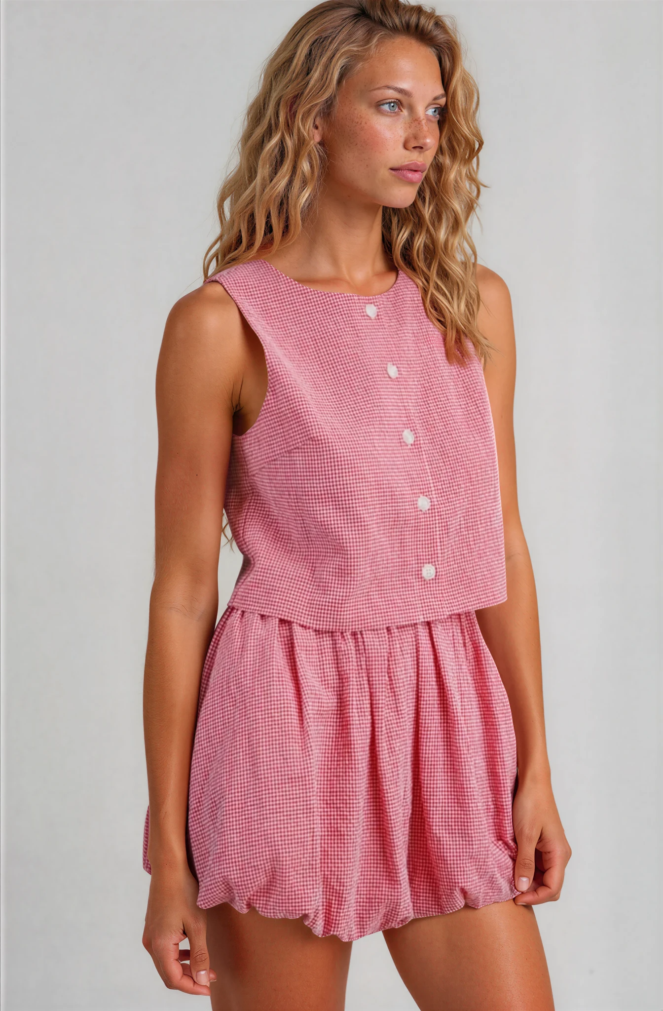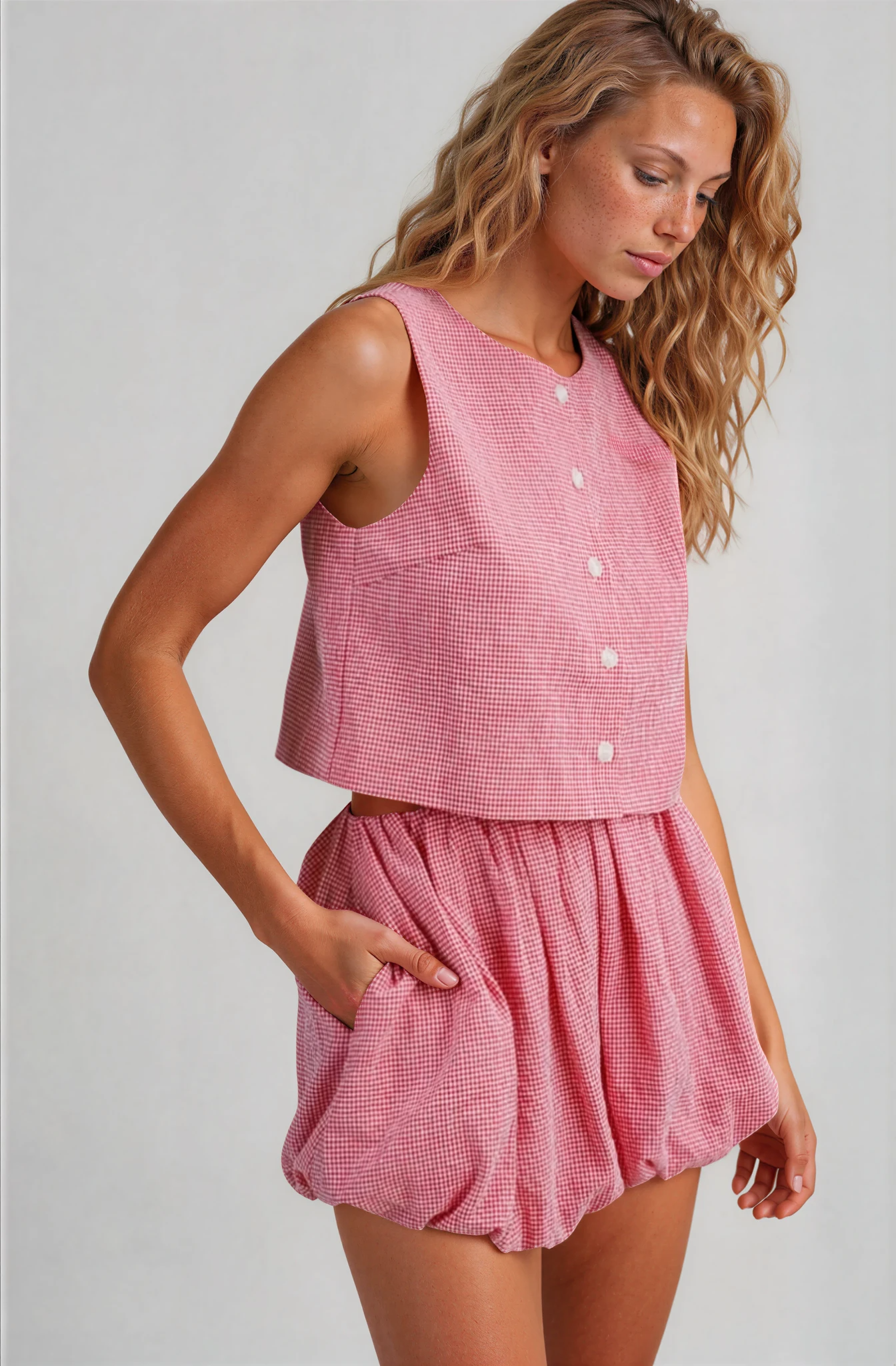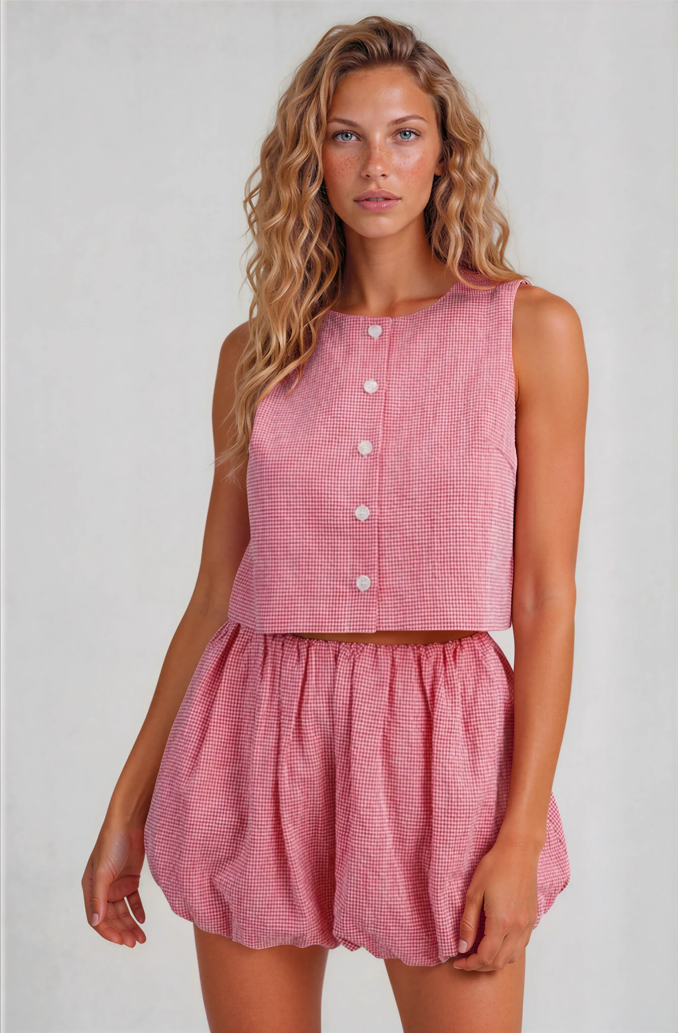 Effortless charm meets playful sophistication in this red and white gingham two-piece set. The sleeveless cropped top showcases a classic round neckline and functional button-down front, while the coordinating mini shorts feature pockets, a comfortable elastic waistband, and charming bubble hem that adds movement and dimension. Fully lined for confidence and comfort. Perfect for warm-weather styling, casual outings, or creating that coveted editorial moment.