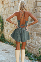 Crafted from washed denim, this romper features spaghetti straps, flared shorts, and a lace-up open-back design for a stylish look.