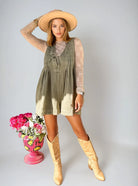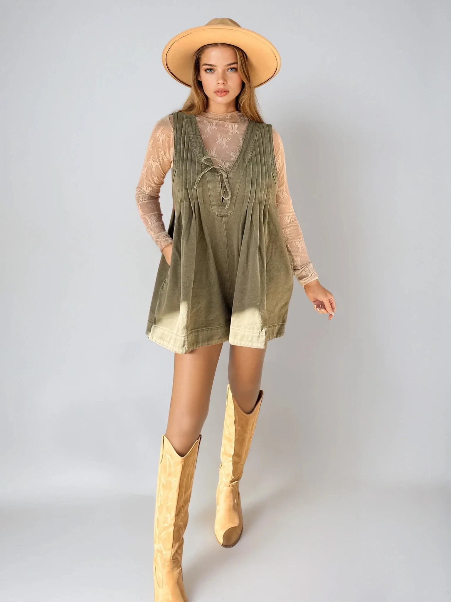 Get ready to rock this trending denim romper. With pleats galore and a front tie for added flair, this laid-back design is the ultimate must-have. Sporting a light sage denim hue, deep v-neck with a string tie and a sleeveless cut, this romper also comes with a side pocket for all your essentials.