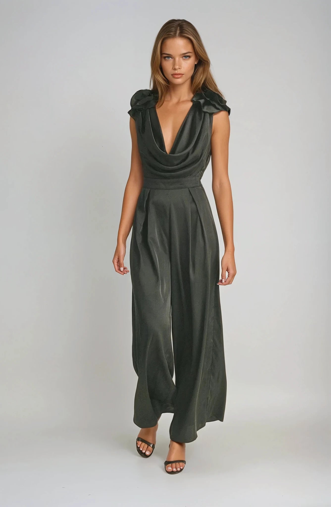 Accentuate your look with the stunning satin 3D floral applique adorning the deep cowl neck and open back of this iconic black jumpsuit. A self tie closure cinches the wide leg silhouette for a look that is sure to leave a lasting impression!