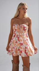 Indulge in the vibrant beauty of the 'Tropical Nights Mini Dress', featuring a stunning floral pattern that adds a pop of color to any summer look. The strapless design exudes elegance, making it a versatile option for any occasion.