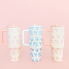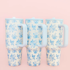 Keep yourself hydrated with this 40 oz. light blue floral print tumbler. Say goodbye to lukewarm beverages with its stainless steel lining that keeps drinks hot or cold all day long. Thanks to its easy-grip handle and narrow base, it's the perfect companion for your on-the-go adventures. Plus, it comes with a reusable straw and a rubber grip handle. Designed and UV printed in the United States.