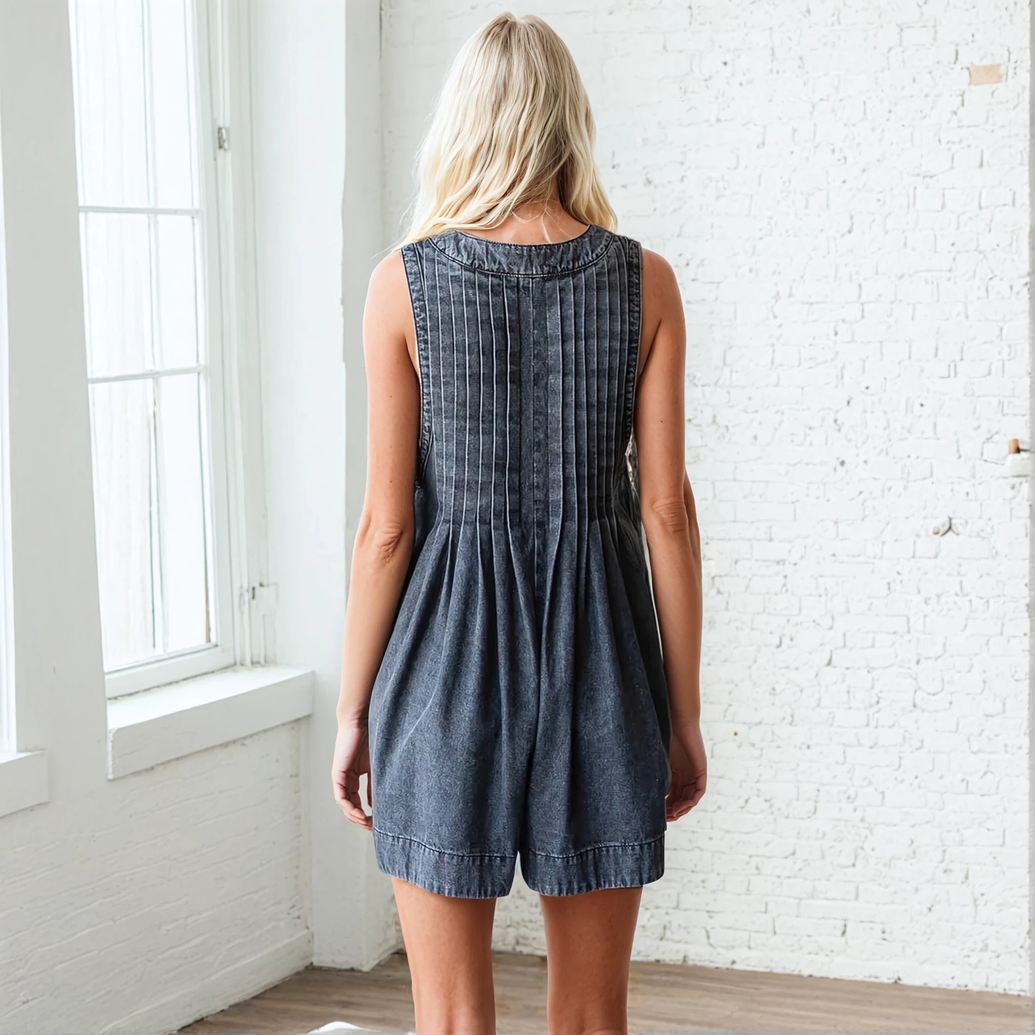 Get ready to rock this trending denim romper. With pleats galore and a front tie for added flair, this laid-back design is the ultimate must-have. Sporting a washed denim look, deep v-neck with a string tie and a sleeveless cut, this romper also comes with a side pocket for all your essentials.