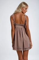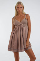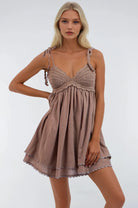 Elevate your style with our Lace Tim Layered Mini Dress in a beautiful brown hue. Featuring intricate lace trim, a charming crochet bust, and a flattering sweetheart neckline, this dress also includes tie straps for a customizable fit and a drop waist for added elegance. Trust us, you'll look and feel amazing in this stunning dress.