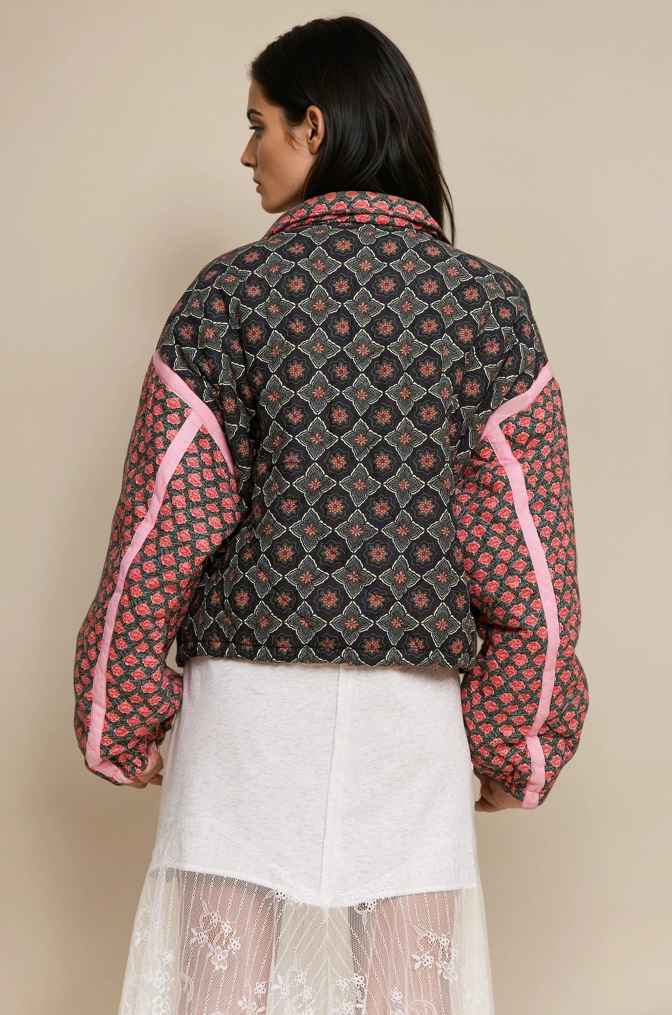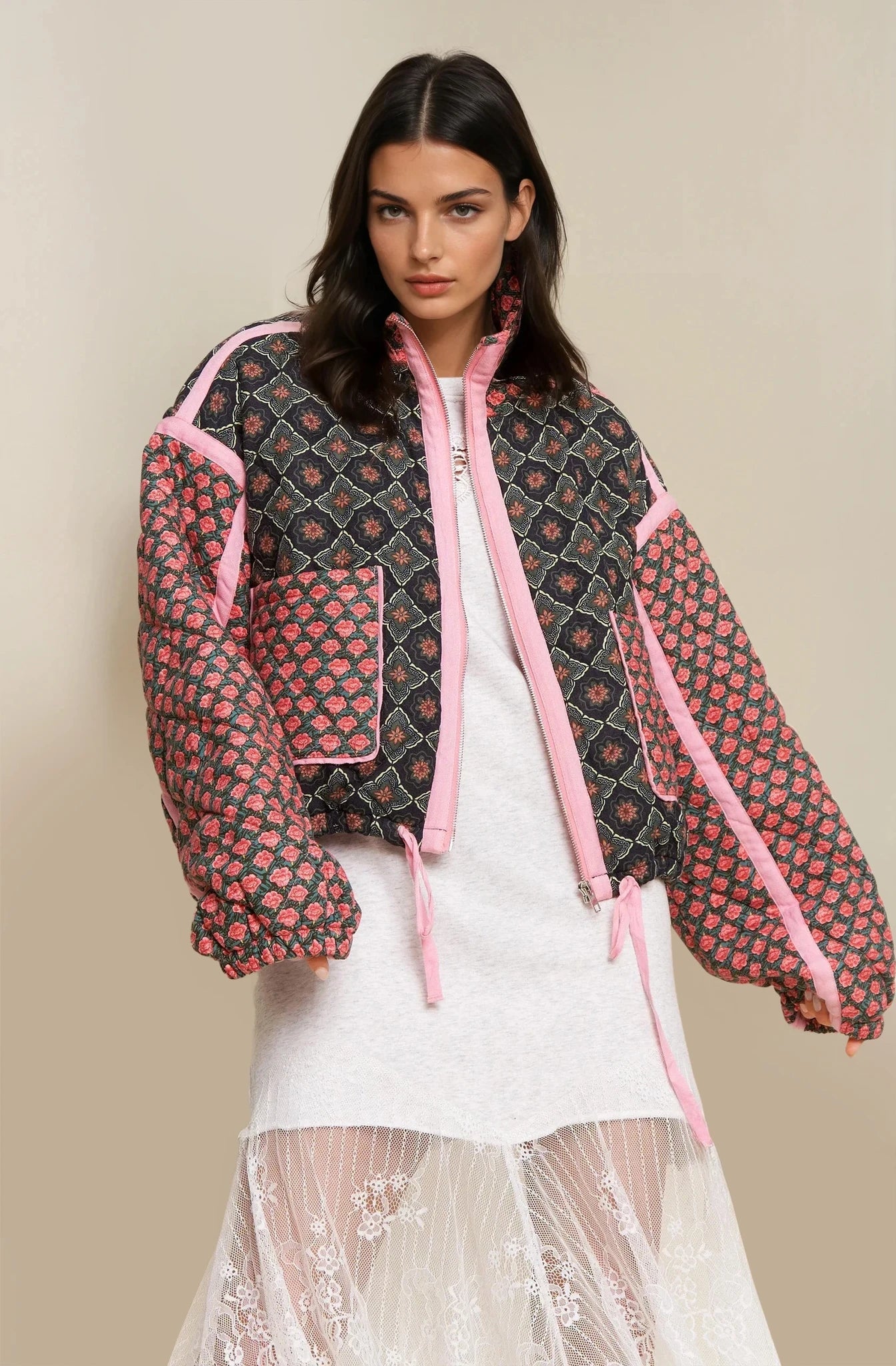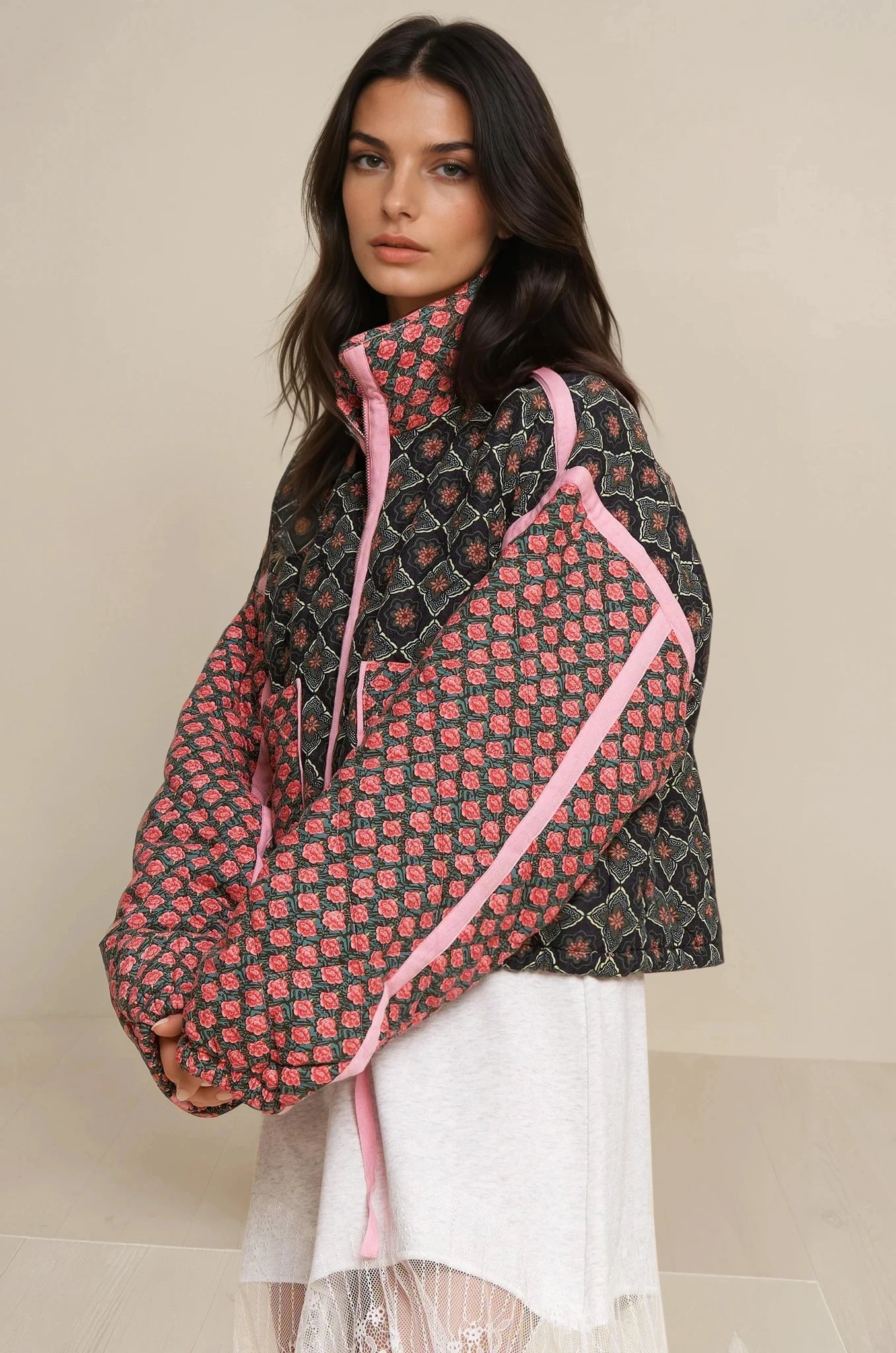 This padded jacket features a rose floral print combined with various patterns in shades of pink and black. It includes a contrasting light pink trim and adjustable waist ties for a customized fit. With a full zip and front pockets, this jacket offers both style and warmth. Its distinctive design brings a charming and playful element to your outerwear collection.