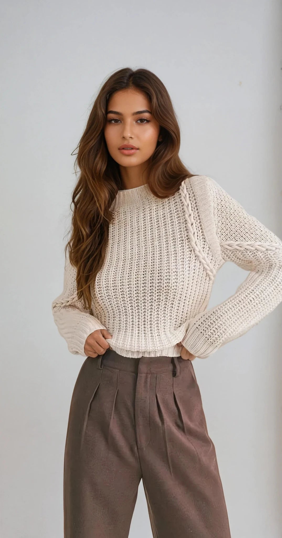 Cozy off-white knit sweater featuring intricate braided detailing for a stylish look!