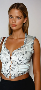 This satin champagne bustier top features elegant black lace and button detailing, with smocking in the back for a comfortable fit. It's classy, chic, elevated, and uniquely versatile.