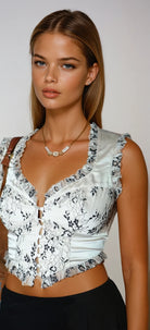 This satin champagne bustier top features elegant black lace and button detailing, with smocking in the back for a comfortable fit. It's classy, chic, elevated, and uniquely versatile.